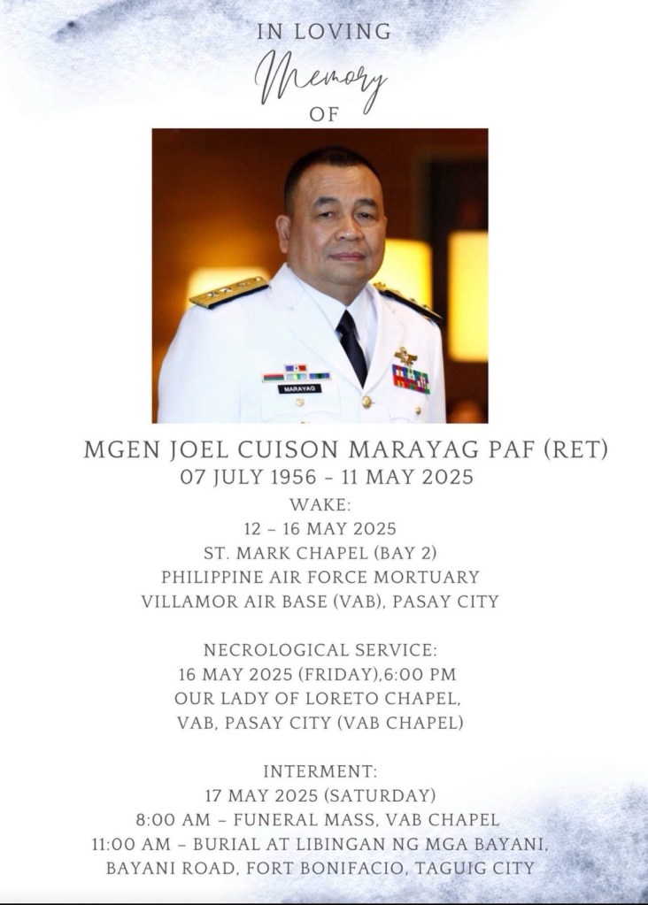 After three months, on 11 May 2025, we were shocked again to learn about the untimely demise of Mistah Joel “Epoy” Marayag. Reportedly, he was resting in their house in Fairview after doing some exercise on a stationary bicycle, when he collapsed. He was rushed to the nearest hospital, but all efforts to revive him were all for naught. He had, notably, undergone an angioplasty two years ago and was well on his way to recovery. But, as we all have accepted with great humility, that if it is God’s will, it shall come to pass, and no human endeavor can prevent it.