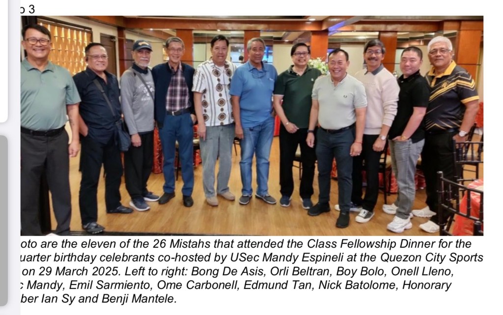 On 29 March 2025, a Class Fellowship Dinner was held at the Quezon City Sports Club in honor of the birthday celebrants of the first quarter of the year. In attendance were twenty-six (26) Mistahs of which eleven (11) were birthday celebrants: Boy Bolo, Bong De Asis, Mie Mendoza, Noel Coballes, Bogs Abogado, Judge Mike Asuncion, Ted Torralba, Herbert Yambing, Nicky Bartolome, Onell Lleno and Danny Saberon. USec Mandy Espineli graciously co-hosted the affair with the 1st Quarter Birthday Boys, livened up as usual with Mapitagan songsters overwhelming the provided singer and computer arranged music.