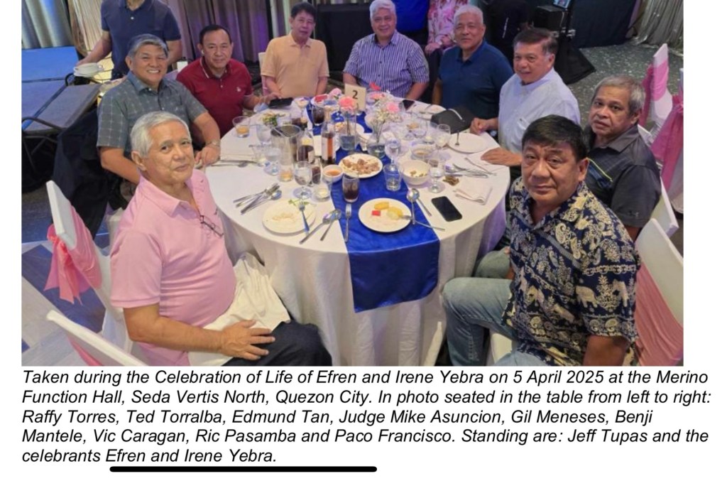 Just a week later, Efren and Irene Yebra celebrated their 45th wedding anniversary and joint birthdays on 5 April 2025. The couple hosted a luncheon at the Merino Function Hall in Seda Vertis North, Quezon City. Fourteen (14) Mistahs attended the affair together with seven (7) Ladies.